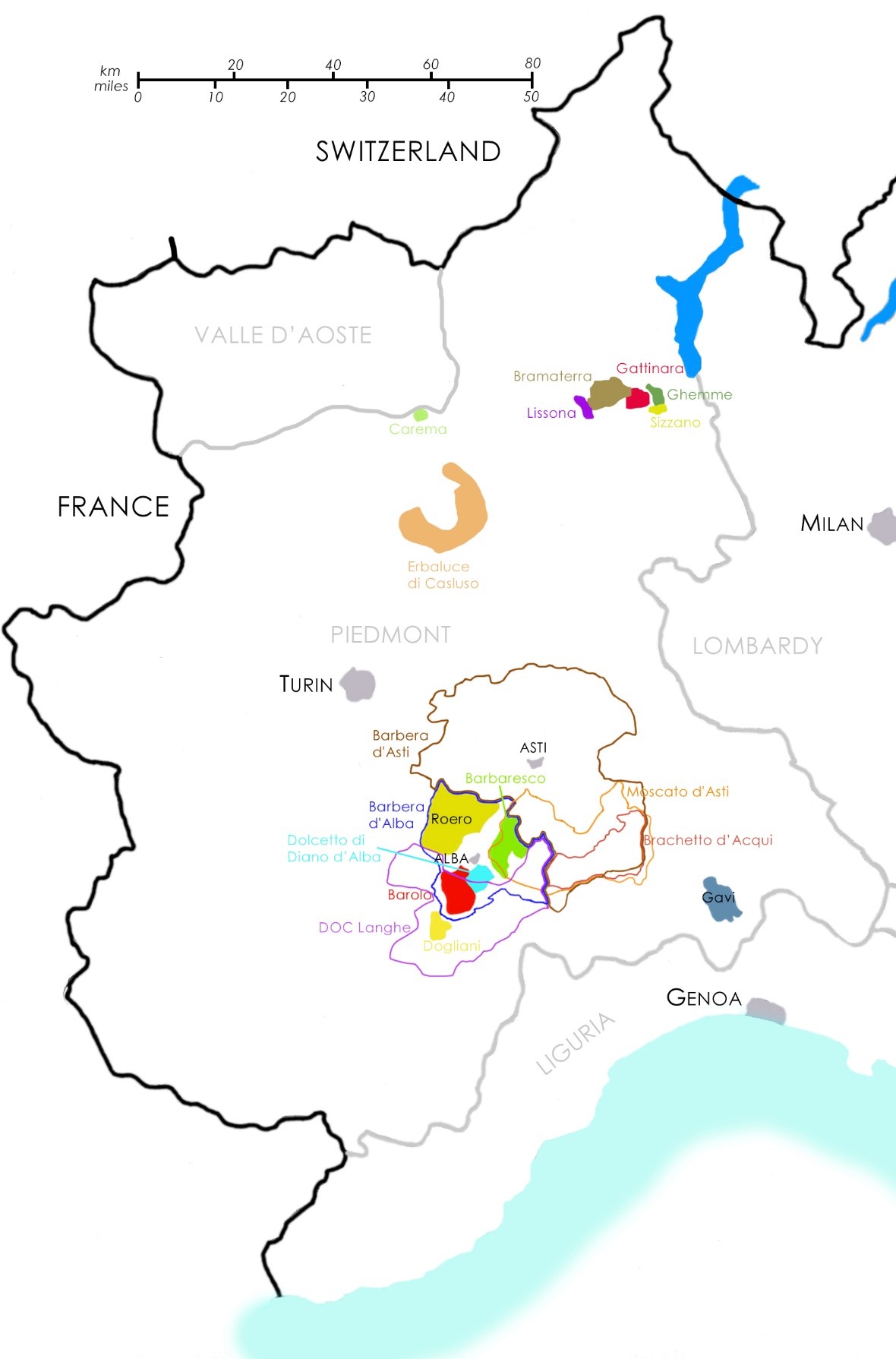 To the north of Turin lie the vineyards of Alto Piemonte, a historic region that is newly fashionable. Wines are supremely elegant Nebbiolo dominant blends and the best of these are from the 90 hectares of the Gattinara DOCG, along with Bramaterra, Ghemme and Lessona. Tiny Carema, with just 18 hectares at the base of the Aosta Valley also makes fine light and fragrant Nebbiolo.